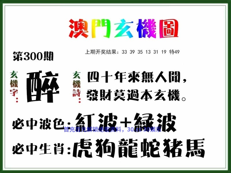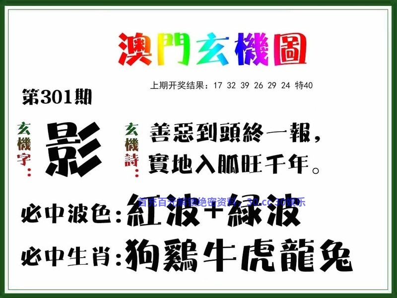 玄机诗:四十年來無人聞,發財莫過本玄機。 必中波色:红波+绿波 必中生肖:虎狗龙蛇猪马 |